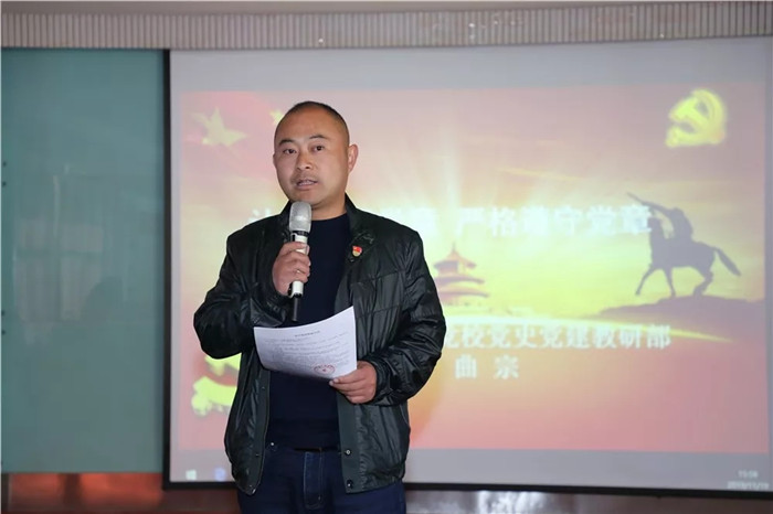 曲宗副教授首先明確了黨章 "根本大法”的地位,指出黨章是規范和指導黨的工作、黨內活動、黨的建設的根本依據。隨后曲宗副教授介紹了黨章的歷史沿革,以及十九大修改黨章的歷史意義和重要內容,號召每一名黨員認真學習黨章,嚴格遵守黨章,時刻與黨中央保持一致,自覺做到"兩個維護”。要求每一名黨員都把黨章作為政治思想建設方面的X光機,每年對照黨章給自己"體檢”一下,紅紅臉、出出汗,牢記入黨初心、遵守黨的紀律,維護一名黨員的思想行為純潔性。