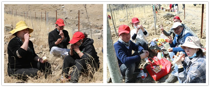 中午十二點,大家饑腸轆轆,公司黨委為大家準備了水果、面包、鹵肉、小零食等食物,勞動后的餐點最是美味,大家圍坐成群,大快朵頤,好不快樂!