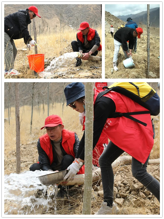 簡餐過后大家再次投入勞動,樹苗已然全部種植入土,最后一項工序是大水灌苗,可是水管長度有限,大多樹苗不能直接澆灌,這絲毫不能難倒阜康人,大家拎著水桶,抱著水盆,拉著水管,細心澆灌每一棵樹苗。