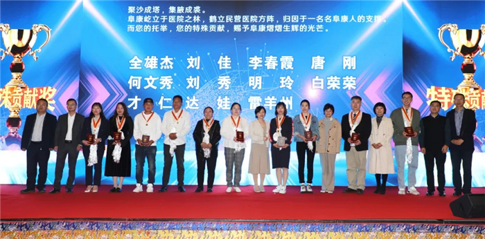 大會第三項,在公司成立22周年暨阜康醫院成立16周年之際,特頒發阜康功勛獎章3枚(每枚黃金100克)、阜康特殊貢獻獎章21枚(每枚黃金50克)、阜康無私援助獎章21枚(每枚黃金50克),向阜康做出卓越貢獻、突出貢獻和無私援助的同仁和友人致敬和感恩。