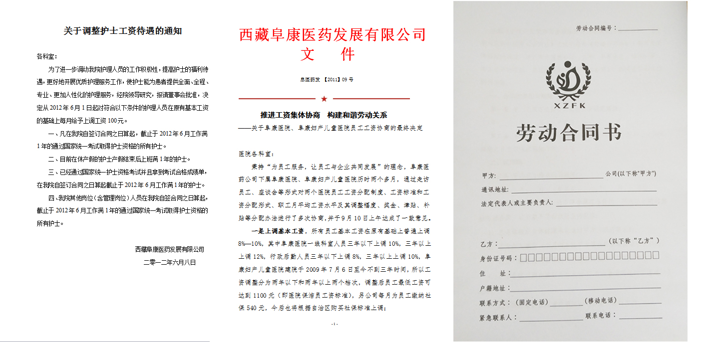 近年來,西藏阜康醫療股份有限公司高度重視工資集體協商工作,始終堅持以人為本,維護職工合法權益,認真貫徹《集體合同規定》。實行院務公開,發揮職代會作用,認真聽取員工在工資集體協商方面的意見和建議,根據需要召開職代會聯席會議,建立穩定的分配機制和增資機制,保障了員工對公司工資分配的知情權、協商權和監督權。認真履行《勞動合同》,設立了員工養老、醫療、工傷、生育、失業等保險,并足額上繳到位。